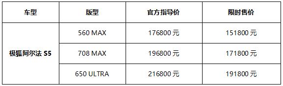 诚意之作,为你闪耀。6月15日,“高性能新奢舒适主义”极狐阿尔法S5正式上市,共推出560 MAX、708 MAX、650 ULTRA三款车型,官方指导售价分别为17.68万元、19.68万元和21.68万元,相比预售官方指导价格进一步让利3000元,并新增了标准续航版车型阿尔法S5 560MAX版...查看详情
