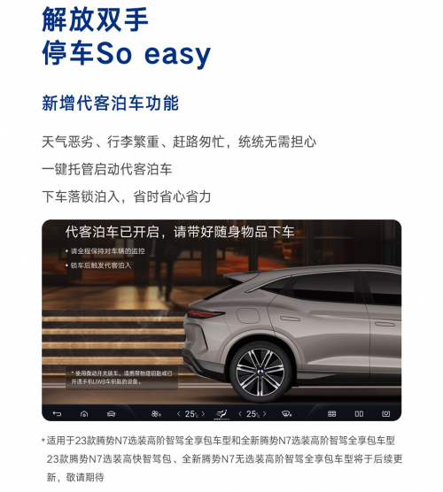 7月4日,腾势N7再迎OTA升级,针对全新腾势N7新增5项、优化13项功能,2023款腾势N7新增4项、优化11项功能,智能驾驶、智能座舱全面进化。其中,“无图”全国高快领航重磅来袭,全国高速、快速路都能开!同时代客泊车、哨兵模式、红灯倒计时等功能联袂登场,为用户带来更加便捷、安心、智能的新豪华出行...查看详情