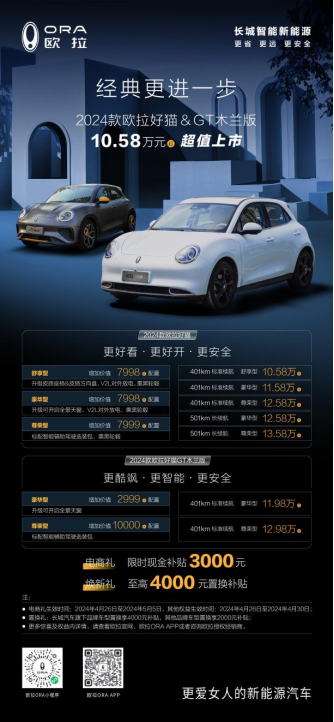 超值而来,经典进阶。4月26日,2024款欧拉好猫>木兰版正式上市,全面升级的颜值、驾趣、智能、安全配置,为用户带来更加轻松愉悦的出行体验。其中,2024款欧拉好猫推出401km和501km两个续航版本,共计五款车型,售价10.58万-13.58万元;2024款欧拉好猫GT木兰版推出两款车型,...查看详情